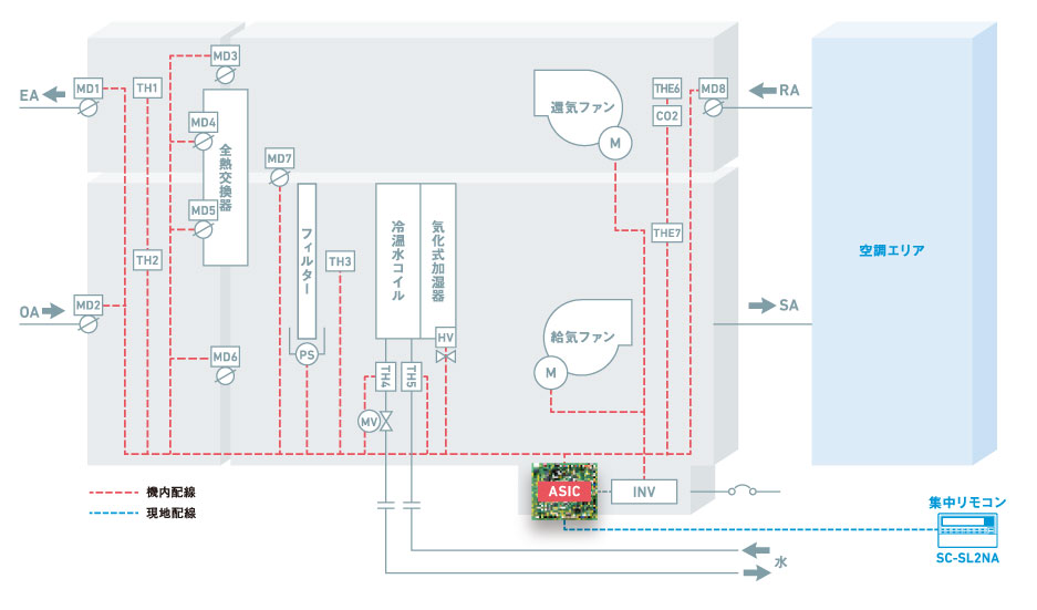 ASICは三菱重工独自通信網であるスーパーリンクシステムに対応しており、三菱重工サーマルシステムズ製集中リモコンによる空調システムの一括管理が可能となります。