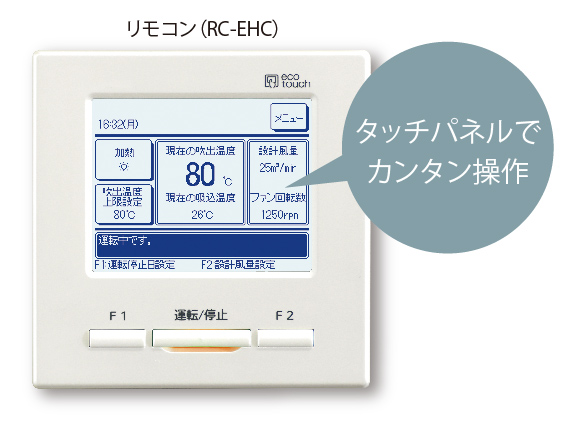 通常の空調機と同様に、大気から熱を取り込む室外機と熱風を直接生成できる室内機で構成されています。空気熱源ヒートポンプとして90°Cの熱風を供給し、効率の面でも定格条件でCOP3.5の高効率を達成しています。