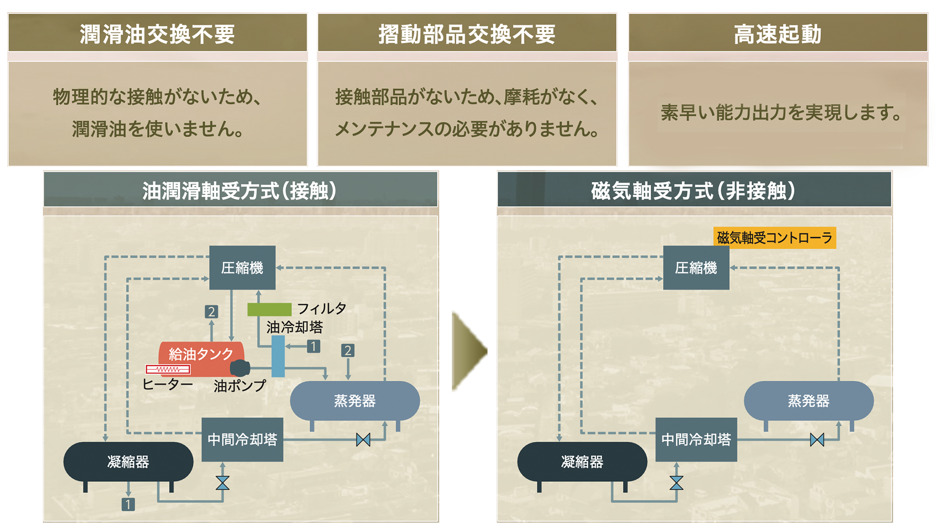 一般空調用途に最適なインバータターボ冷凍機で、大容量並みの性能を実現しました。