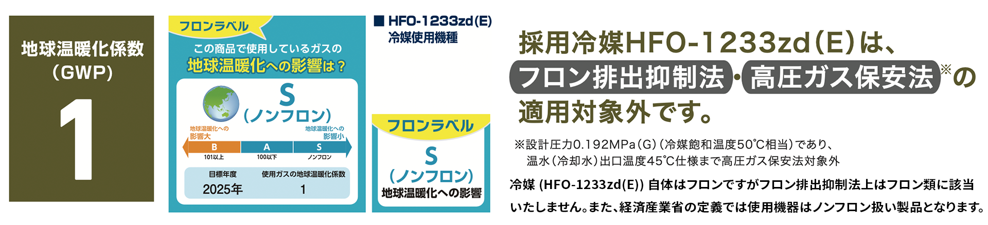 | 冷媒 | HFO-1233zd(E) 「フロン排出抑制法」「高圧ガス保安法」適用対象外 |